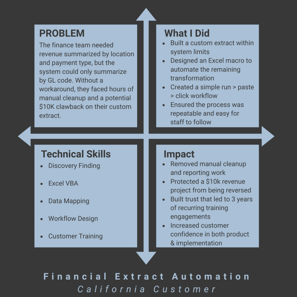 I’m the person teams turn to when something is messy, undefined, or frustrating and they need a solution that just works. My strength is blending technical skill with a calm, human approach that helps customers feel supported, confident, and capable.