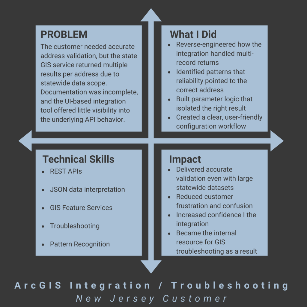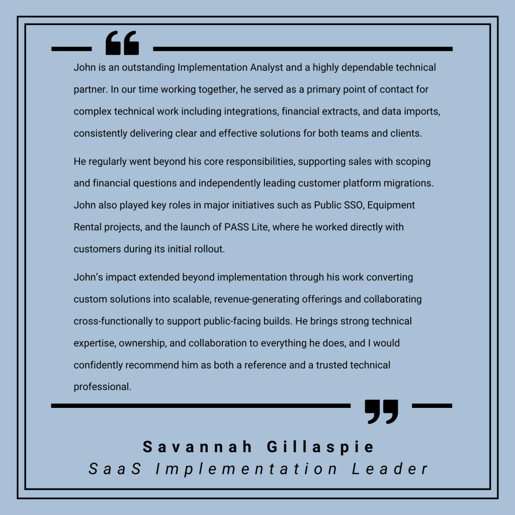 As an Implementation Analyst and Technical Specialist, I owned complex customer onboarding work involving API integrations, data mapping, and workflow design. I worked directly with customers to clarify requirements, test endpoints, troubleshoot integrations, and redesign workflows to fit how teams actually operate. I became known for taking vague or “broken” problems and breaking them into clear steps that led to reliable solutions. Along the way, I built internal tools, automated reporting, and documentation that reduced friction for both customers and internal teams.