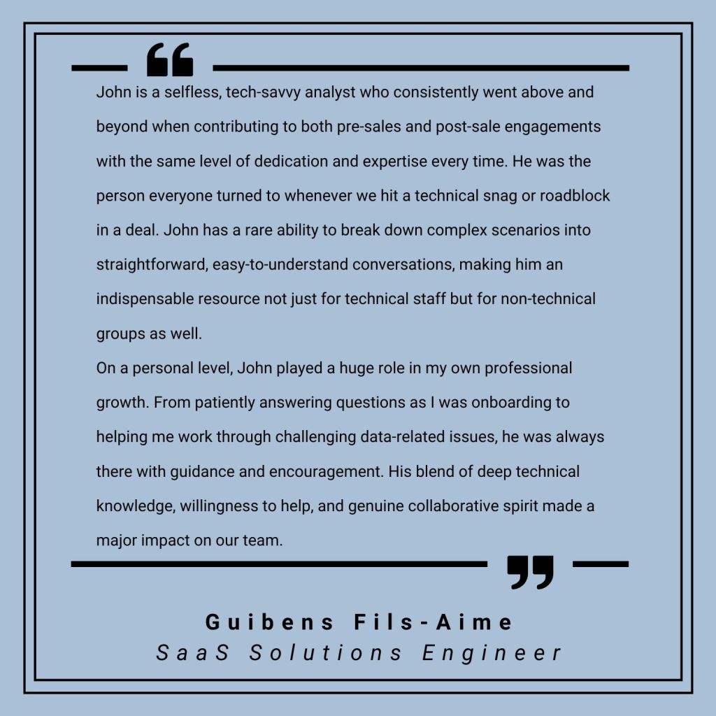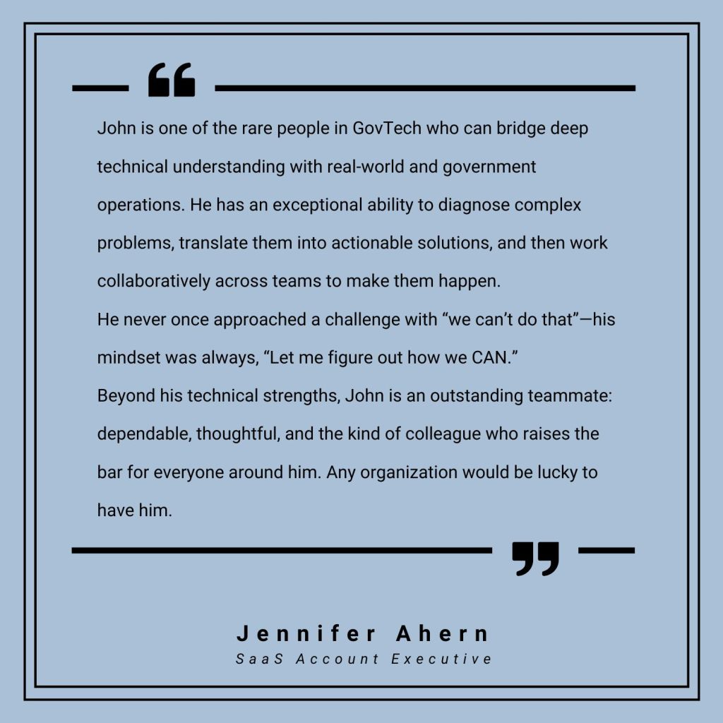 People I’ve worked with describe me as someone who solves problems quickly, brings clarity to confusing situations, and makes teams feel supported. I’m known for being dependable, easy to work with, and able to translate technical details into something everyone can understand.